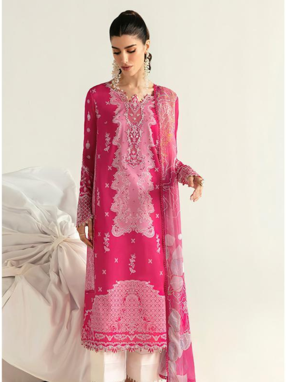 Crafted from premium pure cotton, the top features exquisite embroidery patches on a vibrant pink printed base. The fine detailing on the neckline, sleeves, and daman reflects skilled craftsmanship, giving it a festive yet refined look. Semi-stitched for easy customization, it allows you to design your silhouette just the way you like—from A-line kurtas to straight-fit suits.